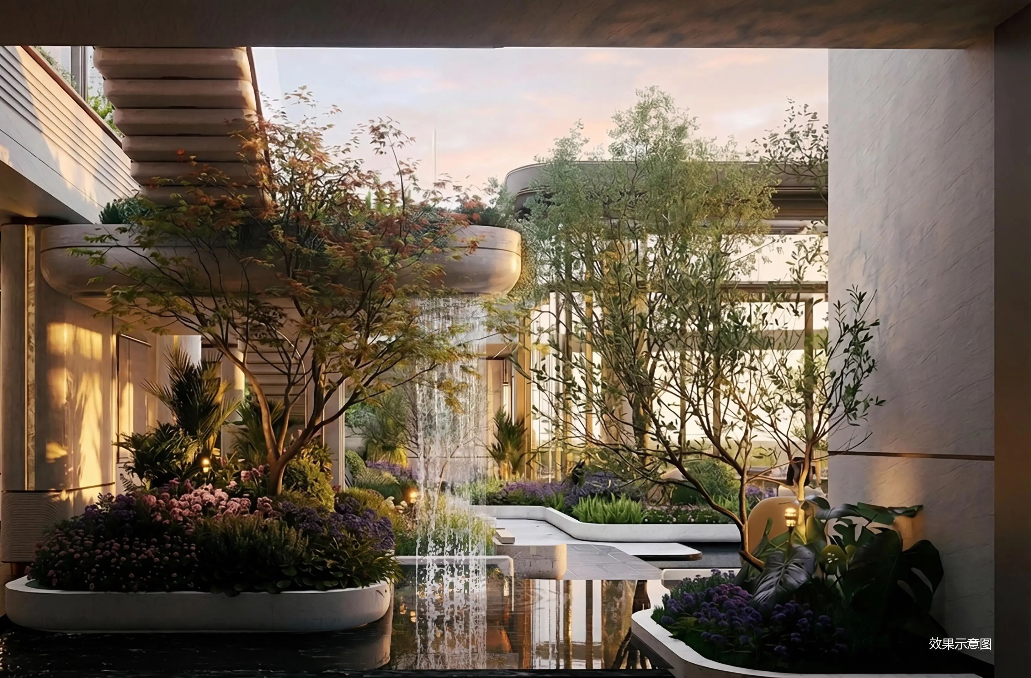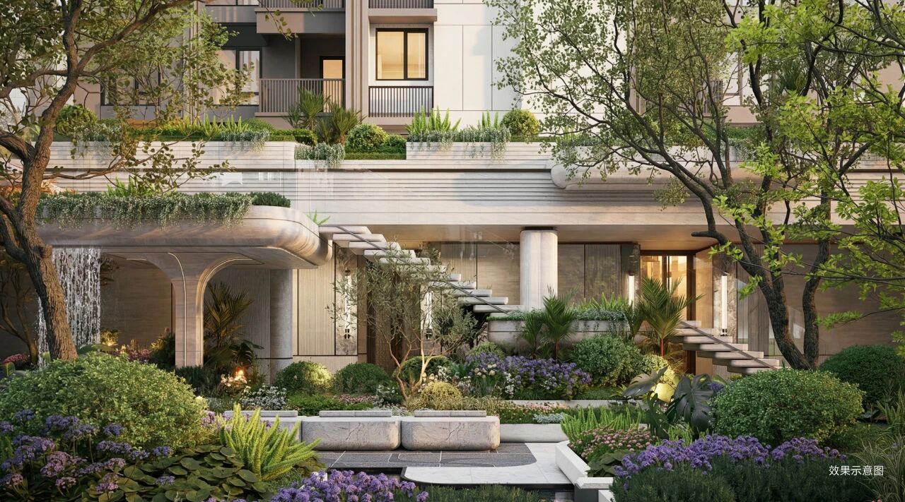 下沉会所以叠水、浮岛花池、悬浮楼梯等营造层次,抬板之上构建邻里共享的“绿色客厅”,铺展互动阳光草坪、层次绿景、儿童乐园及空中休闲区等,形成绿意盎然、亲子互动、邻里社交相融共生的立体景观系统。